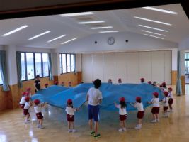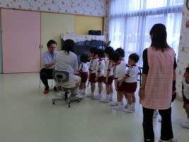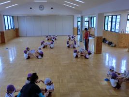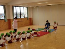 今日、年中・年少組は園庭で集会を行いました...
