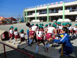 秋の気持ちのよい晴天の今日、年長組は鉄棒で逆上りの指導を受けました...