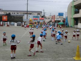 今日は気温が低く、曇り空でしたが、年長組は2クラス(ゆり、ふじ)(すみれ、すずらん)に分かれて外で体操指導を行いました...