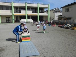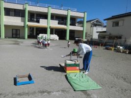 今日の年中組の体育指導は、園庭で跳び箱、鉄棒、ボール遊びを行いました...