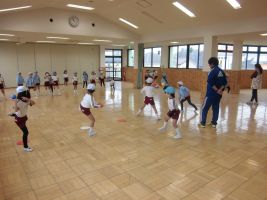 今日の年長組の体育指導は、ホールでボールを使った運動とゲームを行いました...