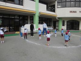 今日の年中組の体育指導は、園庭で縄跳びとボール遊びを行いました...