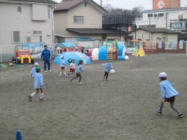 今日の年長組の体育指導は、園庭でサッカーを行いました...