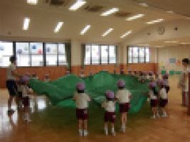 今日の年中組の体育指導は、ホールでパラバルーンを行いました...