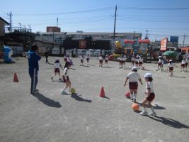 今日の年長組の体育指導は、園庭でサッカーを行いました...