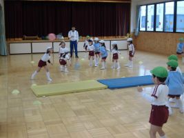 今日の年中組の体育指導は、ホールでボール運動を行いました...