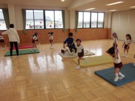 今日の年長組の体育指導は、ホールでマット運動と壁当てドッジボールを行いました...