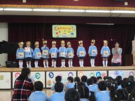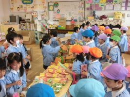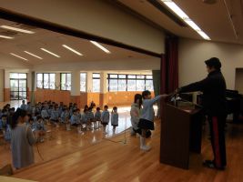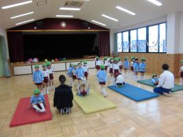 今日の年中組の体育指導は、ホールでマット運動とボールを使ったゲームを行いました...