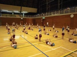 今日の年長組の体育指導は、市民体育館で組体操を行いました...