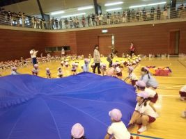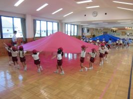 今日の年中組の体育指導は、ホールでパラバルーンを行いました...