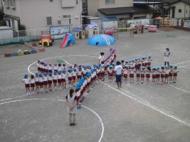 今日の年長組の体育指導は、園庭で組体操とリレーを行いました...