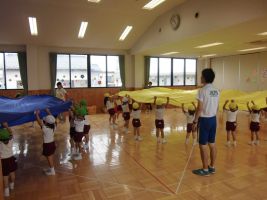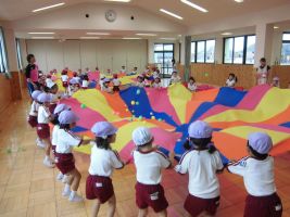 今日の年中組の体育指導は、ホールでパラバルーンを行いました...