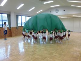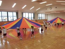 今日の年中組の体育指導は、ホールでパラバルーンを行いました...