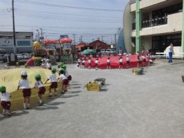 今日の年中組の体育指導は、園庭でパラバルーンを行いました...