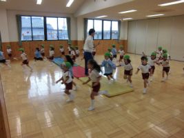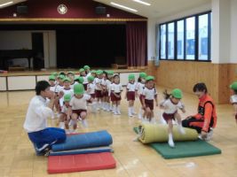 今日の年中組の体育指導は、ホールでマット運動を行いました...