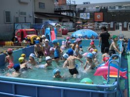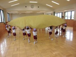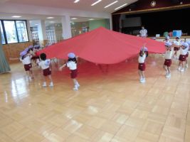 今日の年中組の体育指導は、ホールでパラバルーンを行いました...
