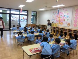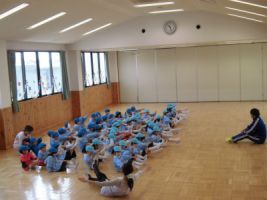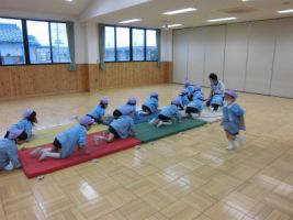 今日の年中組の体育指導は、ホールで集団行動の練習を行いました...