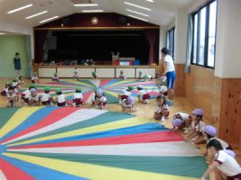 今日の年中組の体育指導はホールでパラバルーンを行いました...