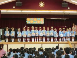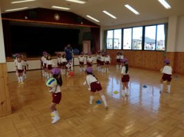 今日の年長組の体育指導は、ホールでドッジボールの練習を行いました...